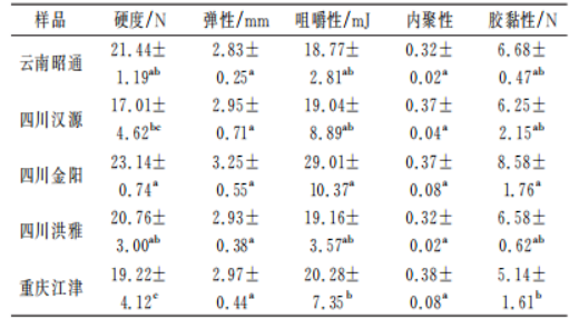 表3 青花椒產(chǎn)地對花椒魚片質(zhì)構(gòu)的影響(n=3)