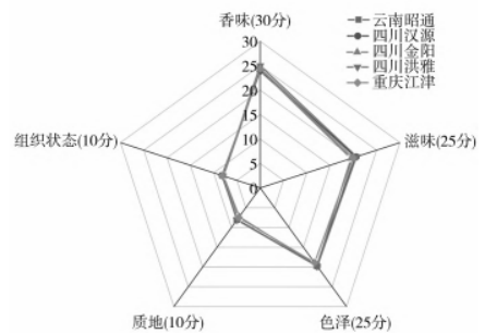 采用表1中花椒魚片的評分標(biāo)準(zhǔn)對不同產(chǎn)地青花椒制作的花椒魚片進行感官分析,結(jié)果見圖1。以四川洪雅青花椒為原料制作的花椒魚片評分最高,整體感官評分為81.6分,尤以花椒魚片的香味和滋味評分較高,但差異不顯著(P>0.05)。