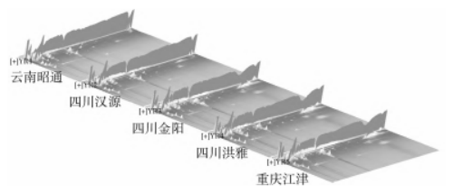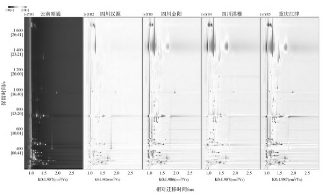 青花椒產(chǎn)地對花椒魚片風(fēng)味物質(zhì)的影響花椒魚片樣品的揮發(fā)性物質(zhì)GC-IMS三維圖譜見圖2。圖2中每個反應(yīng)離子峰代表一種揮發(fā)性風(fēng)味物質(zhì),顏色越深,表示物質(zhì)越豐富。使用不同產(chǎn)地的青花椒制作花椒魚片時,可以直觀地看到四川金陽和重慶江津樣品組中風(fēng)味物質(zhì)的種類和濃度與其他樣品組差異較明顯。花椒魚片特征性風(fēng)味成分GC-IMS差異譜圖見圖3,此圖是將圖2的三維圖投影到二維平面上的俯視圖,具體是以氣相色譜的保留時間作為縱坐標(biāo),以離子遷移時間作為橫坐標(biāo),以云南昭通青花椒樣品組譜圖為參比,將另外4個樣品組的譜圖扣減參比后得到的。差異圖譜中每個點代表一種揮發(fā)性風(fēng)味物質(zhì)。結(jié)果顯示,與云南昭通樣品組相比,四川金陽和重慶江津樣品組的風(fēng)味物質(zhì)濃度較高。