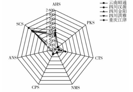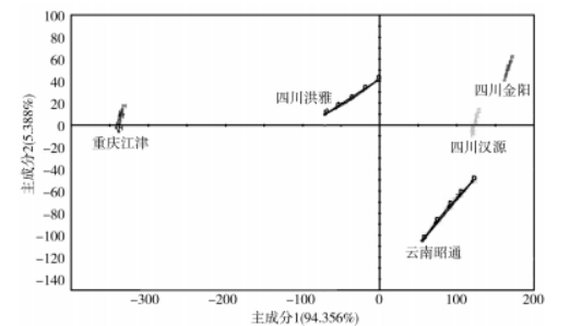 利用電子舌檢測儀自帶軟件對花椒魚片樣品的數(shù)據(jù)進行主成分分析(PCA),結(jié)果見圖5。主成分1和主成分2的貢獻率分別為94.356%和5.388%,總貢獻率達99.744%,超過85%,表明這兩個主成分涵蓋了大多數(shù)樣品信息,可以用來表征花椒魚片樣品的滋味特征。5種樣品散點區(qū)域分散明顯,表明電子舌能夠較好地區(qū)分不同產(chǎn)地的花椒魚片。由圖5可知,重慶江津樣品組與其他4組樣品的滋味差異最大。由圖6可知,花椒魚片在傳感器SCS、AHS、CTS、NMS上響應(yīng)值較高,其中AHS、CTS、NMS分別為酸味、咸味、鮮味專一性傳感器,SCS為非專一性傳感器。差異性最大的SCS傳感器可能和青花椒中麻味物質(zhì)含量的高低有關(guān),其中重慶江津樣品組的響應(yīng)值最大。