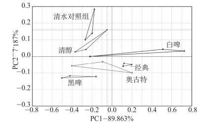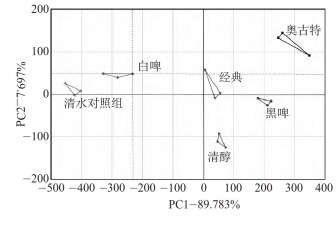 啤酒鴨電子鼻檢測結果主成分分析如圖2。主成分1和主成分2的貢獻率分別為89.86%和7.19%,累計97.05%,幾乎涵蓋所有原始信息,同時能很好的區(qū)分開各組啤酒鴨。白啤組位于第一象限,黑啤組位于第四象限,均與其他組距離較遠,說明風味差異較大。三種黃啤中奧古特和經(jīng)典組距離較近,但清醇組與之較遠,說明同一類型啤酒制作的啤酒鴨,風味也會存在較大差異。