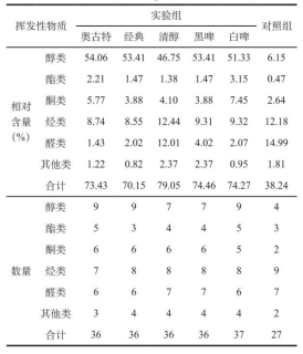 通過GC-MS測定不同種類啤酒制作啤酒鴨樣品的風味物質及其相對含量。各樣品鑒得醇類、酯類、醛類、酮類、烴類以及其他類(醚類、含氮類及呋喃等)揮發(fā)性化合物,其中來源于啤酒的醇類物質占據(jù)實驗組最重要位置。由表3可知,實驗組所檢測的揮發(fā)性化合物,各樣品風味物質含量皆不同,但醇類和烴類都為其主要化合物,種類及含量皆高于對照組。