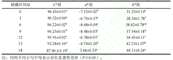 由表2可知,在貯藏18d后,漿水青稞奶茶色度整體呈現(xiàn)出L*值降低、a*值及b*值增加的現(xiàn)象,反映在感官上表現(xiàn)為奶茶光澤下降,色澤變紅、變褐,且時間越長,顏色變化越明顯。