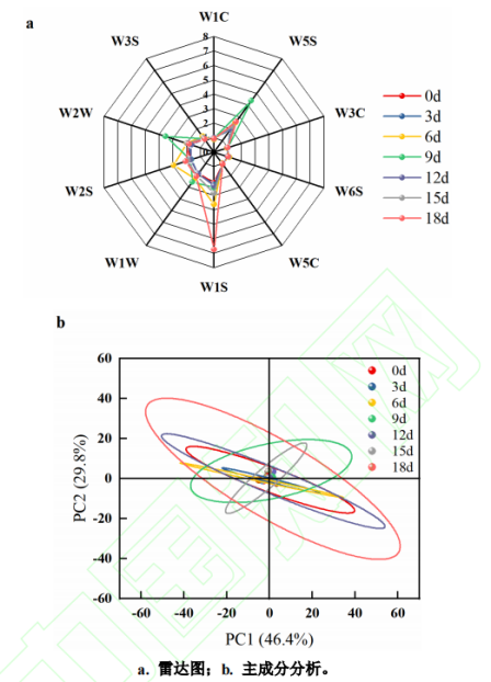 漿水青稞奶茶4℃貯藏過程呈味物質(zhì)的變化如圖5所示。由圖5a可知,10個傳感器中對漿水青稞奶茶響應(yīng)強度較大的傳感器有W1S、W5S、W2W,它們分別對應(yīng)甲基類、氮氧化合物和有機硫化物的靈敏性。隨著貯藏時間的延長,第18天漿水青稞奶茶在W1S傳感器上響應(yīng)值差異最為明顯,這可能是因蛋白質(zhì)分解過程中產(chǎn)生了甲烷等物質(zhì)物。為進一步明確不同貯藏期間漿水青稞奶茶風(fēng)味特征的差異,對電子鼻傳感器的響應(yīng)值進行了主成分分析(PCA)。由圖5b可知,4℃貯藏漿水青稞奶茶的第一主成分貢獻率為46.4%,第二主成分貢獻率為29.8%,累積貢獻率達76.2%,說明不同貯藏時間的奶茶樣本間揮發(fā)性氣味存在一定差異,其中第一主成分起到了最為關(guān)鍵的作用,使用電子鼻能夠準確識別和區(qū)分。而貯藏18d內(nèi)奶茶氣味響應(yīng)值空間距離較近,說明漿水青稞奶茶貯藏過程中風(fēng)味輪廓未發(fā)生明顯變化,低溫有利于保持漿水青稞奶茶的風(fēng)味的流失。